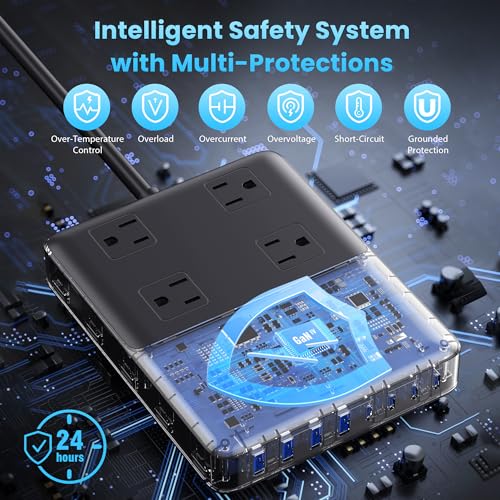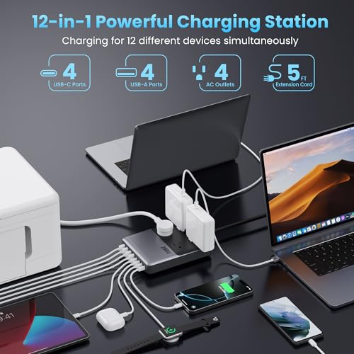 • 【Widely Compatible Power Strip with USB C】The 12 in 1 multiports power strip equipped with 4 AC and 8 USB ports can power up most of your home appliances,laptops and mobile devices at once with ease. Desktop charger is widely compatible with laptops(Macbook Pro/Air,DELL,HP etc.),Smartphones(iPhone 16/15/14/13/12/11/X/8/7/6/SE series,Samsung Galaxy,Google Pixel,LG,more Android Cellphones),iPad Pro,Desktop Computer,Smartwatch,Power Bank,Earphones,Kettle,Projector,Printer,Speaker,Router and more.