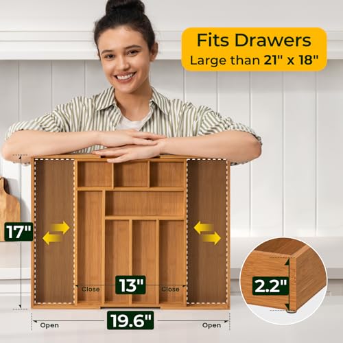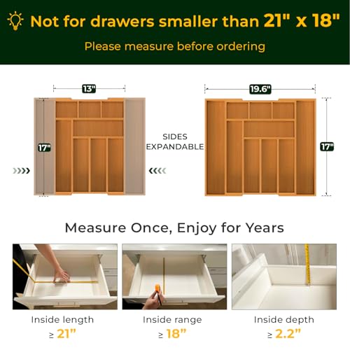 • ADJUSTABLE WIDTH (13″ – 19.6″) – CHECK YOUR SIZE: Our organizer seamlessly expands from 13″ to 19.6″ wide, ensuring a beautiful, gap-free look in your drawer. It’s designed for drawers at least 18″ long and 21″ wide. It also features removable dividers, allowing you to create a custom layout for your specific tools and utensils.
